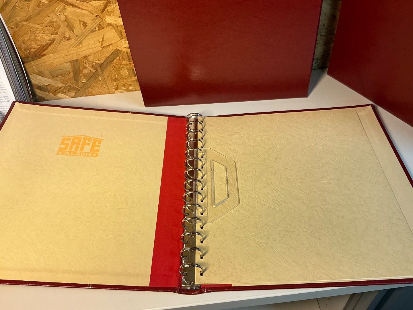 leere gut erhaltene Binder mit Gebrauchsspuren, mit Deckblatt + Blattheber, inkl. Schuber, 1 Binder mit Aufdruck Weltraum